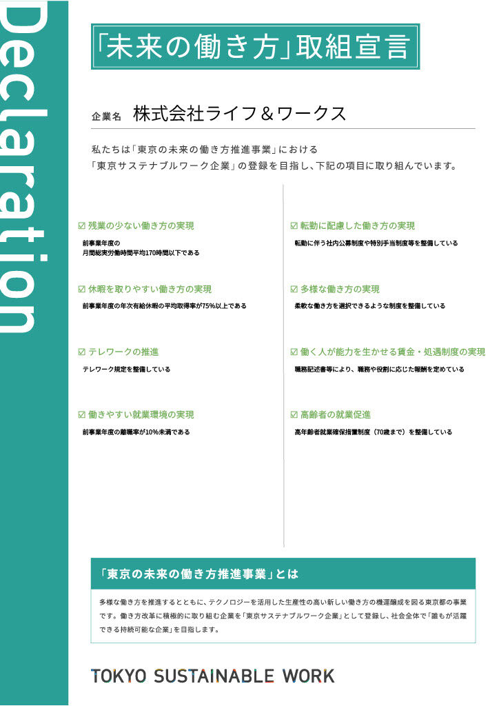2024年8月5日 / 最終更新日時 : 2024年8月5日 lwadmin TOPICS 「未来の働き方」取組を宣言します 私たちは「東京の未来の働き方推進事業」における「東京サステナブルワーク企業」登録を目指し、柔軟な働き方を実現する各種項目に取り組んでいます。