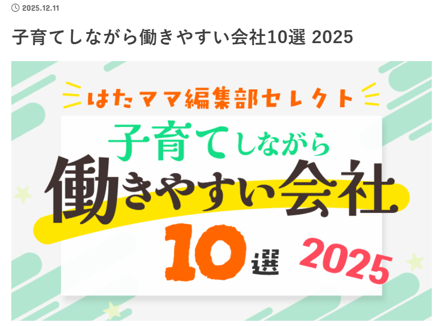 この度、 「はたママproject」による「子育てしながら働きやすい会社10選 2025」に選出されました。